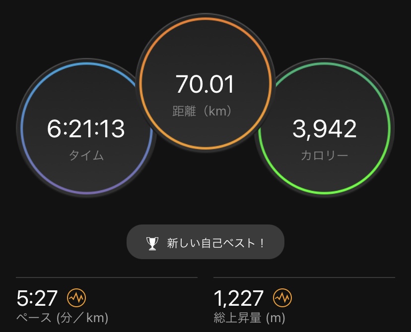 本当に100㎞走れるか不安ですが、今回の70㎞で耐性がついてさらに当日のアドレナリンでなんとか走り切れるようにするしかないですね。